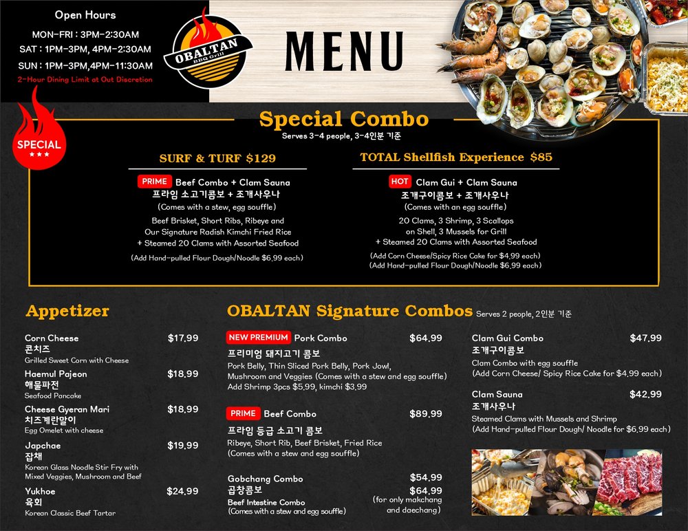 Introducing Obaltan, a vibrant Korean barbeque and seafood spot in Fort Lee, NJ. This trendy eatery offers a casual yet lively atmosphere, perfect for groups or late-night dinners. With a menu featuring Surf & Turf combos, beef, pork, and scallop dishes, Obaltan delivers consistently good food and generous portions. Customers rave about the attentive service and the unique culinary experience of having their food cooked for them at the table. The standout dishes include the beef combo and the Surf & Turf combo, which includes a variety of seafood options. Don't miss the kimchi fried rice with egg, a crowd favorite. While pricing may lean towards the higher end, the quality of the food and the inviting ambiance make Obaltan worth a visit. Next time you're craving Korean barbeque, head to Obaltan for a memorable dining experience.
